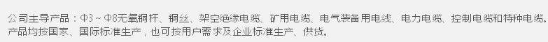 公司目前產(chǎn)品有:Φ3~Φ8無(wú)氧銅桿、銅絲、1-35kV裸電線、電氣裝備用電線、電力電纜、控制電纜和特種電纜。產(chǎn)品均按國(guó)家、國(guó)際標(biāo)準(zhǔn)生產(chǎn),也可按用戶需求及企業(yè)標(biāo)準(zhǔn)生產(chǎn)、供貨。